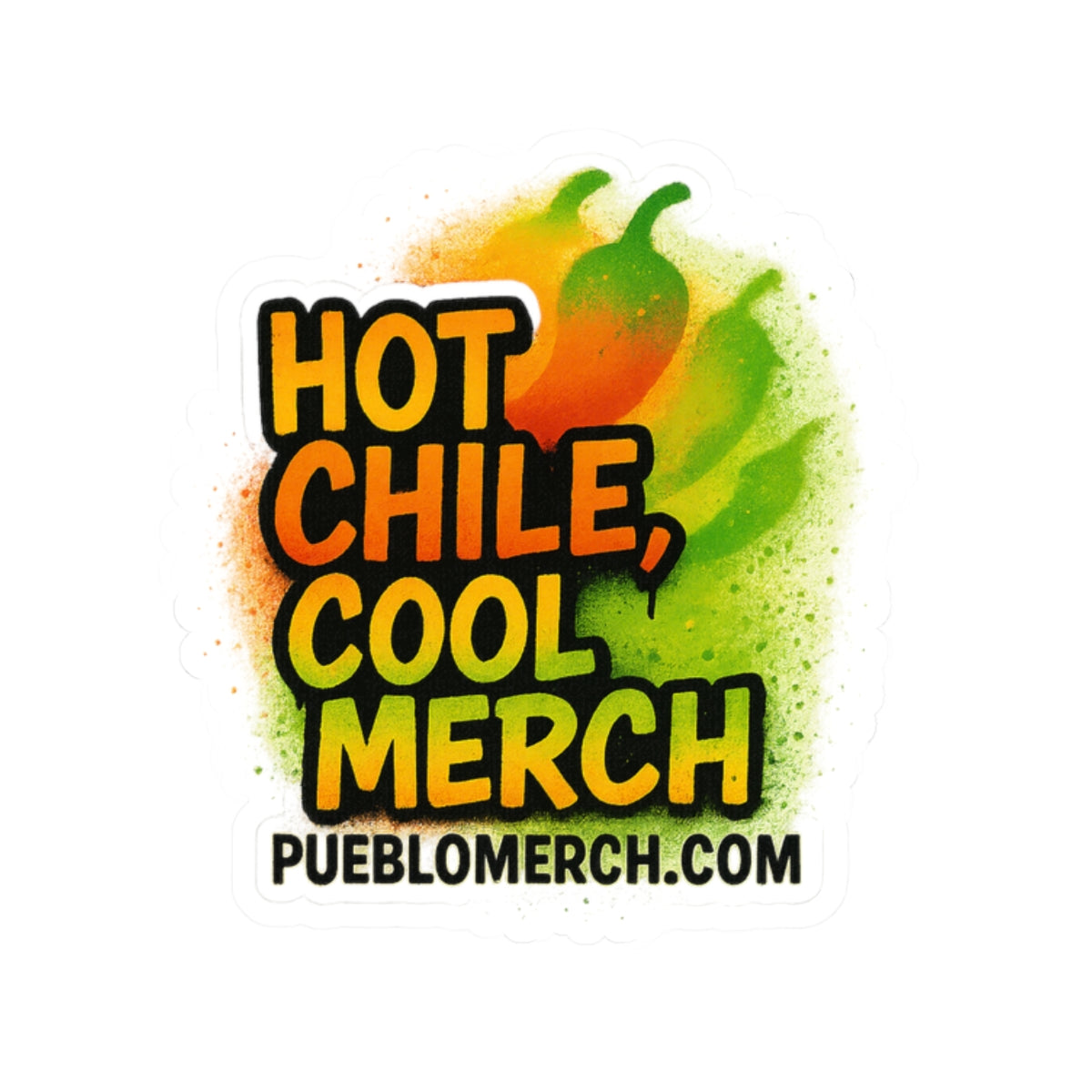 Spice up your gear with this bold graffiti-style sticker shouting out Pueblo pride! Featuring “Hot Chile, Cool Merch” in spray-paint reds, yellows, and greens, it’s got that chile festival vibe locked in with a splash of pepper art in the background.