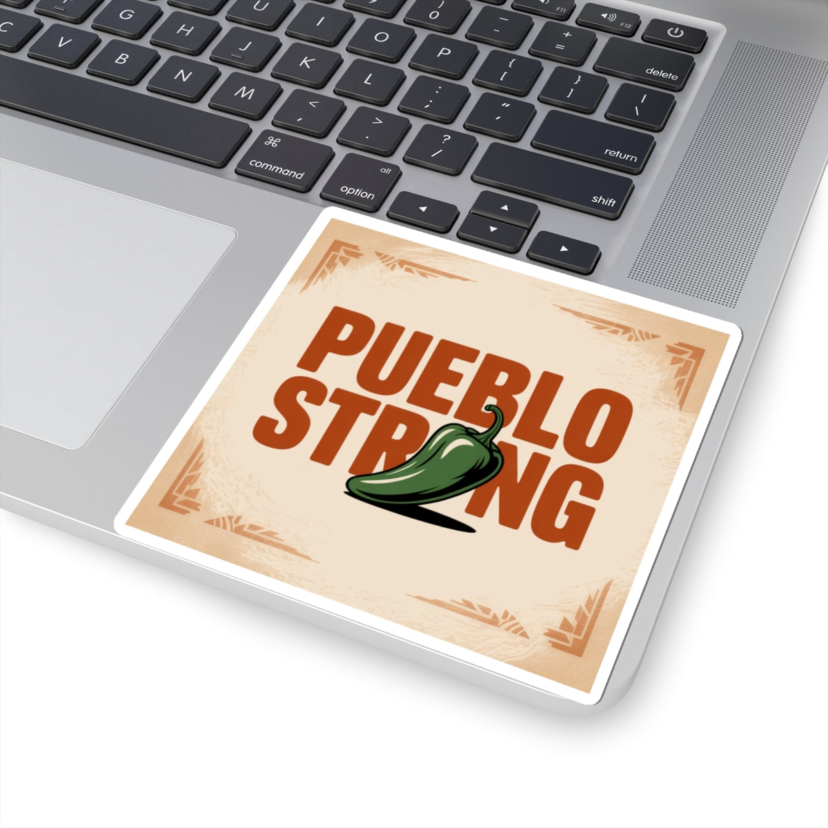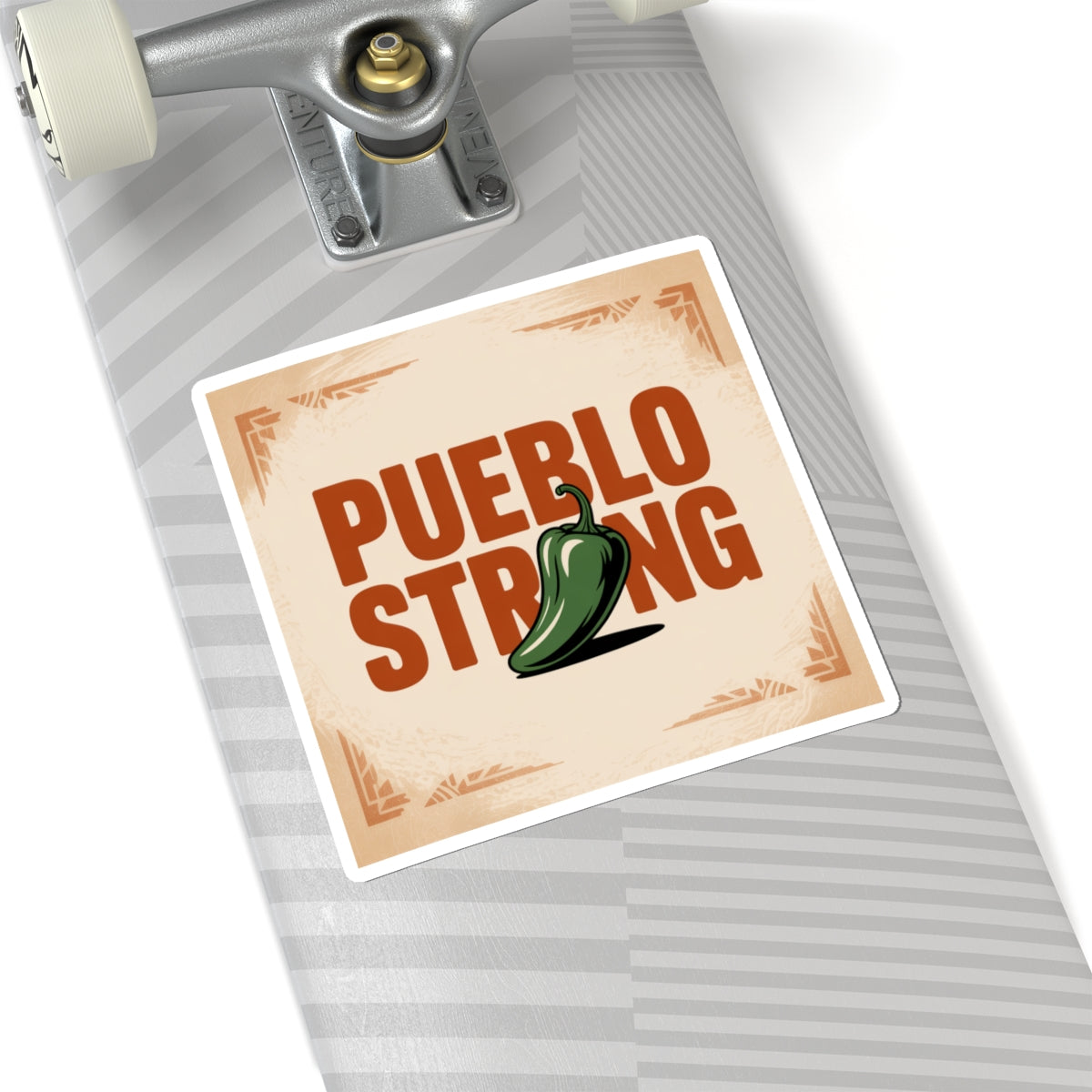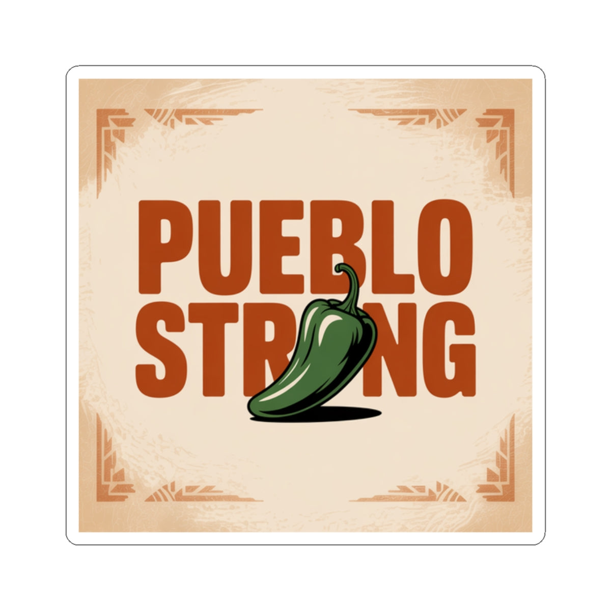 Pueblo Strong kiss-cut sticker featuring Pueblo Chile Pepper, Green Chile, and Pueblo Pride. Vibrant colors and glossy finish add a pop of color to laptops, journals, and windows. Perfect for adults who love Pueblo culture and celebrations like Pueblo Pride.
